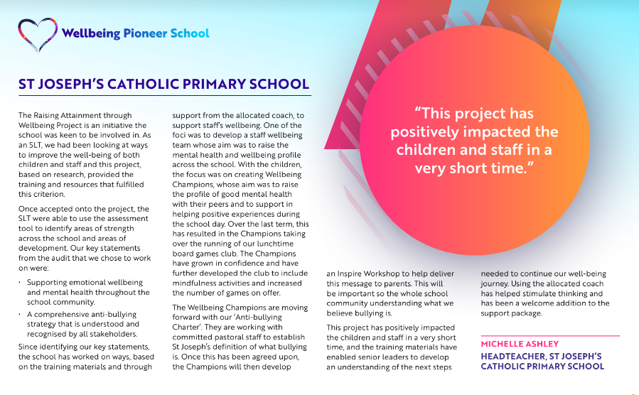 Michelle A., Headteacher at St Josephโs, expressed her satisfaction with the project’s impact: โThis project has positively impacted children and staff in a very short time. The training materials have enabled senior leaders to develop an understanding of the next steps needed to continue our well-being journey.โ
